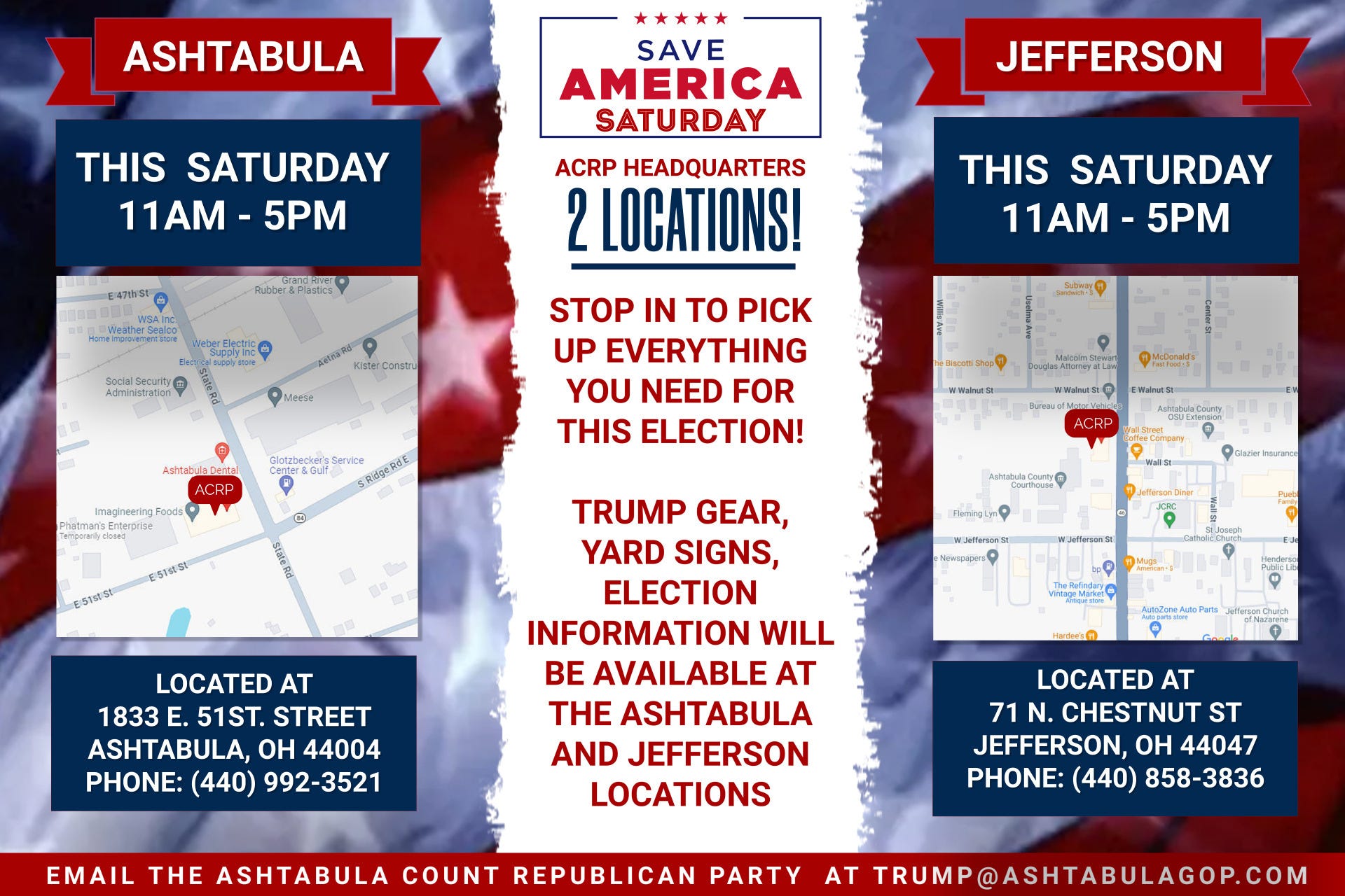 ALL NEW TRUMP GEAR, REGISTER TO VOTE, UPDATE REGISTRATION, ELECTION INFORMATION, CANDIDATE LITERATURE AND PICK UP YOUR FREE TRUMP YARD SIGN