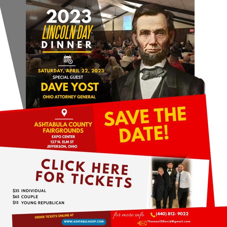 Join your Ashtabula County Young Republicans in our Annual Lincoln Day Dinner, this year held on April 22nd! Come enjoy an open buffet and bar, while catching up with friends and meeting your local and state candidates. Keynote Speaker will be Ohio Attorney General Dave Yost.
