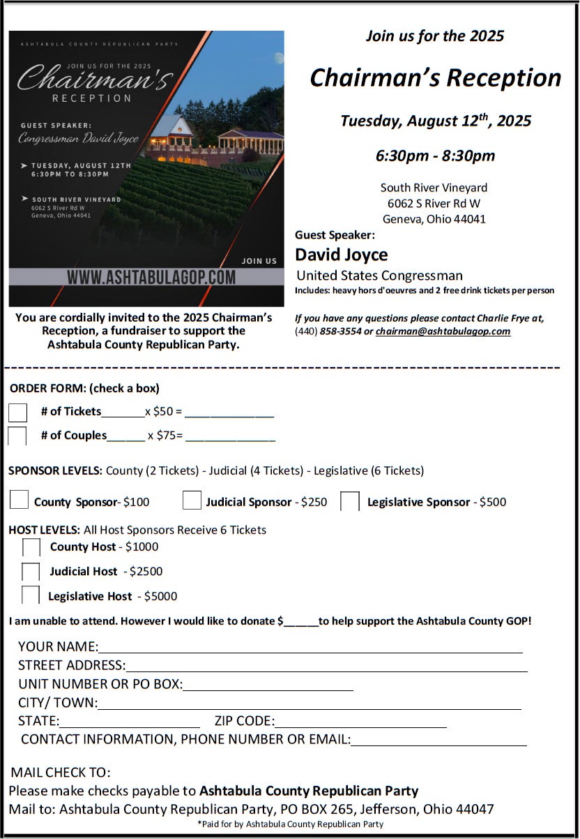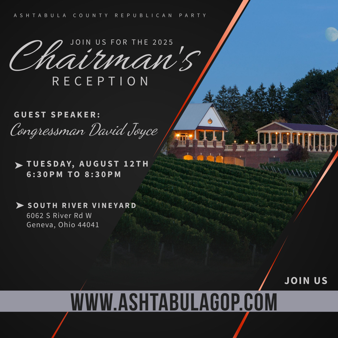 Join Chairman Charlie Frye and the Ashtabula County Republican Party for our annual Chairman’s Reception on Tuesday, August 12th from 6:30-8:30pm at South River Vineyard! Hear from Special Guest Congressman Dave Joyce, local and state officials, and support conservative government for Ashtabula County.