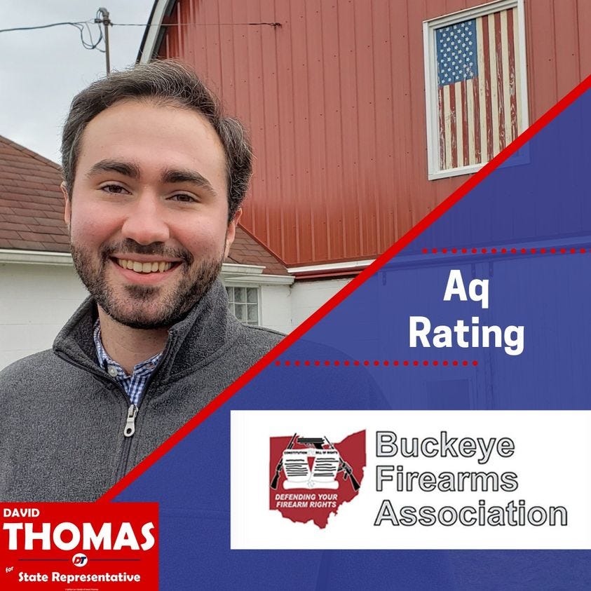David Thomas recently received the Aq rating from the Buckeye Firearms Association PAC in his race for 65th District State Rep. As someone without a legislative voting record yet, this is the best rating from Ohio's 2nd Amendment leader and shows his commitment to our 2nd Amendment rights.