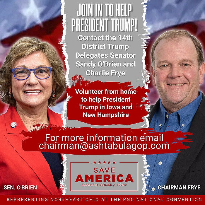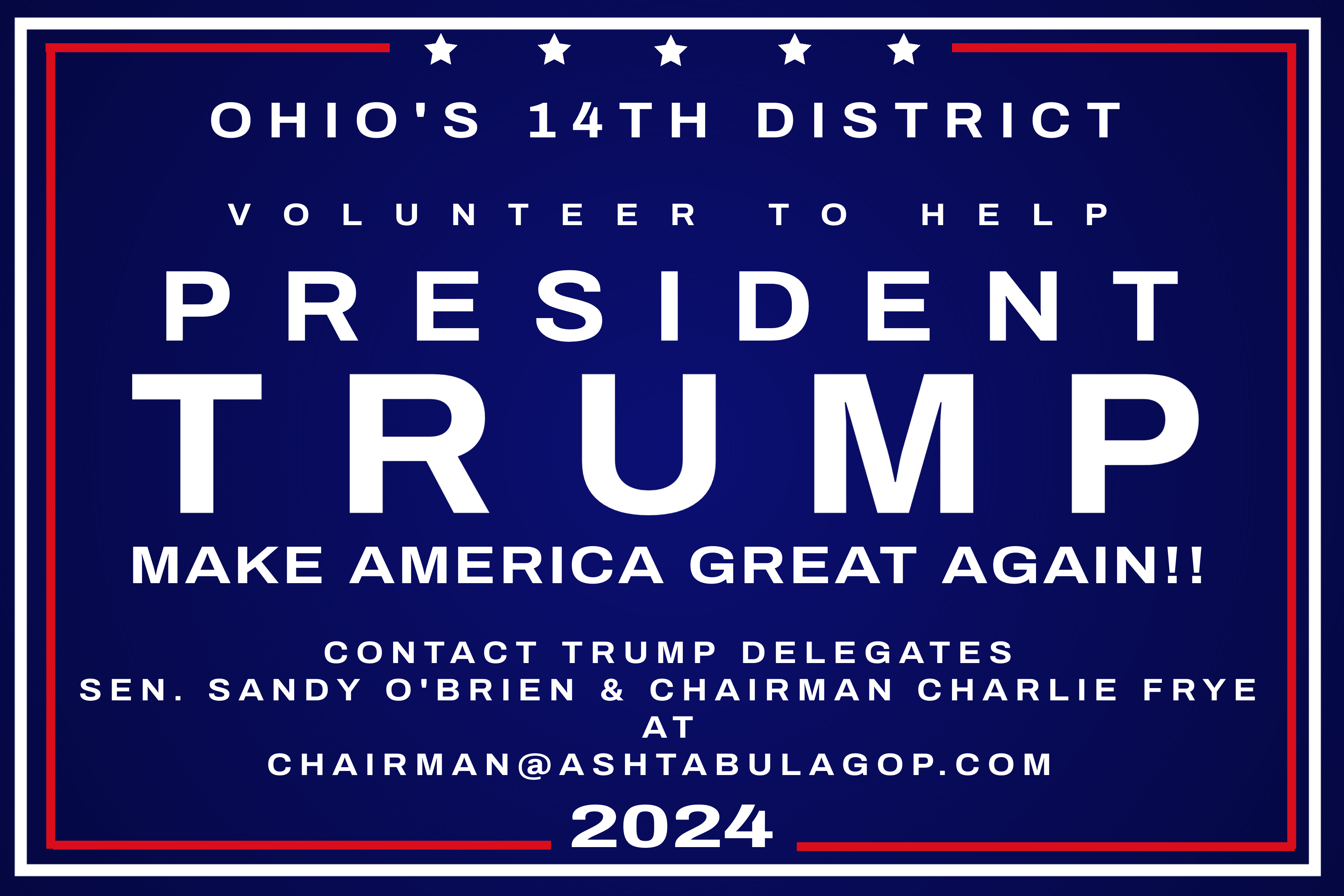 The Trump campaign is looking for volunteers to make phone calls into Iowa and New Hampshire for the respective Caucus and primary election. Team Trump will set you up to make calls from the comfort of your home. You will be needed from January 13-15 and January 20-23. Email chairman@ashtabulagop.com with your name, phone, and email if you are interested! chairman@ashtabulagop.com