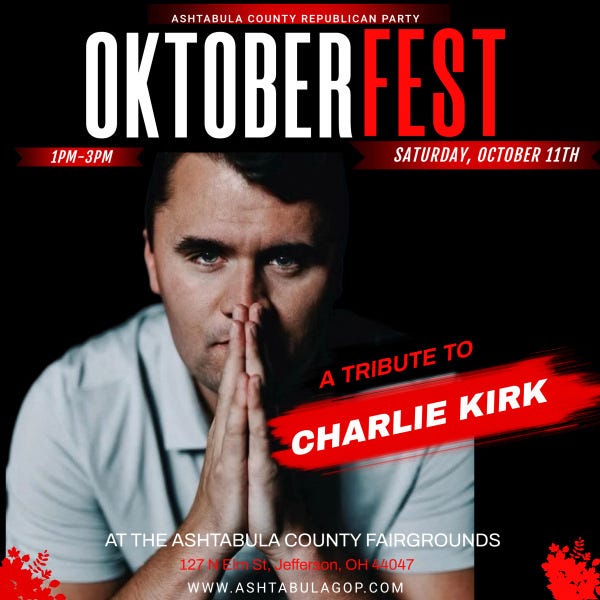 If you are planning to attend Oktoberfest: A Tribute to Charlie Kirk next weekend, we kindly ask that you purchase your tickets soon or reach out to Charlie Frye at chairman@ashtabulagop.com to confirm your attendance.