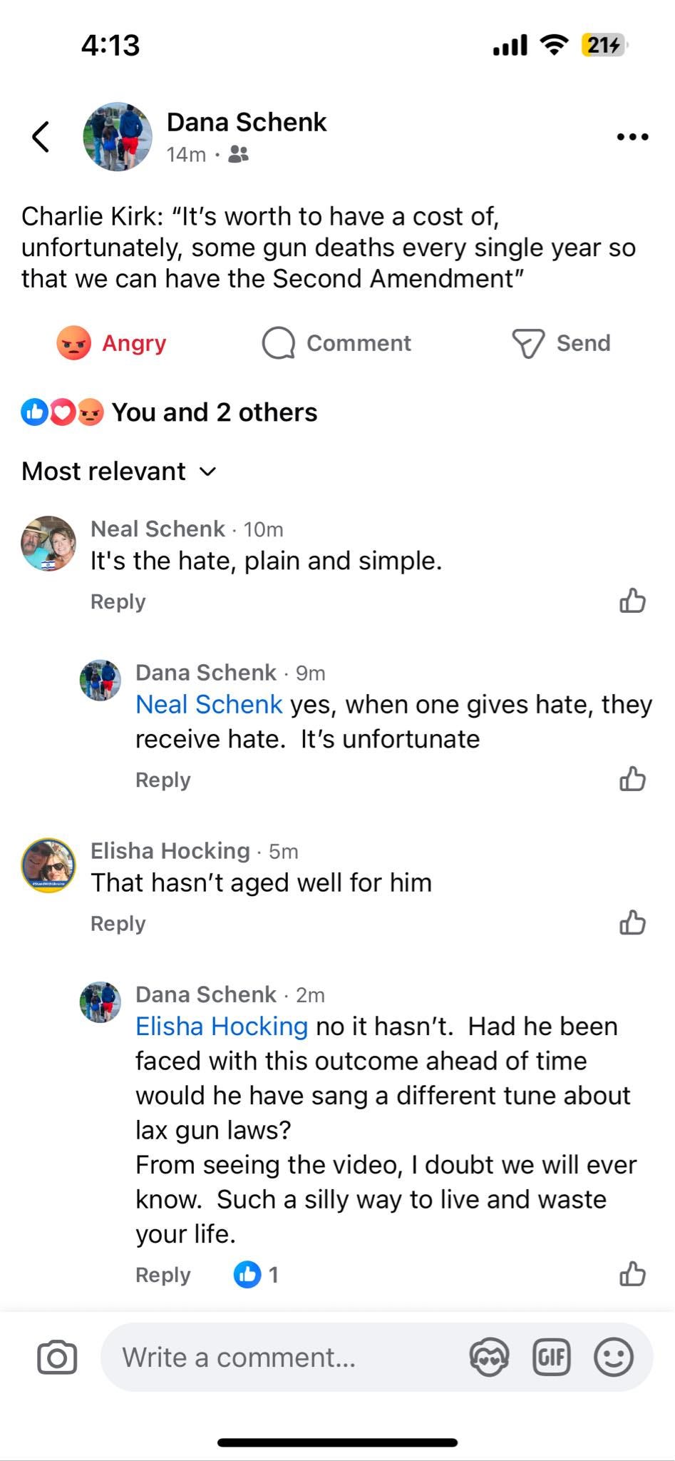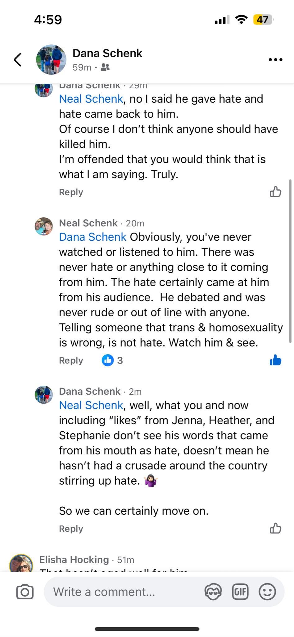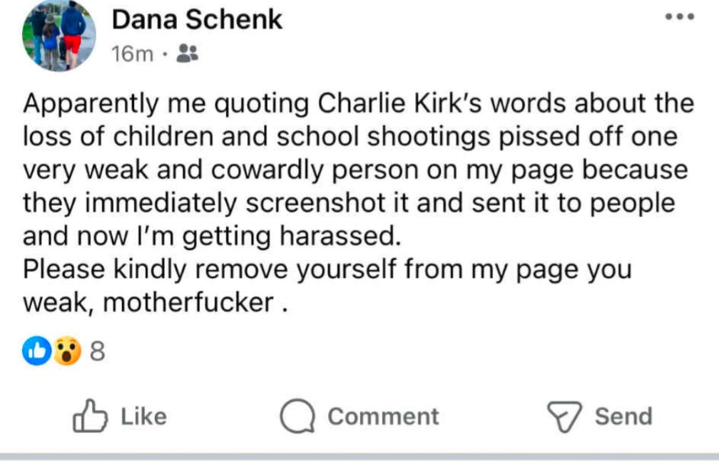 Councilwoman Schenk’s public comments regarding the political assassination of Charlie Kirk were not only insensitive, they were disgraceful. At a time when our nation is mourning the loss of a husband, father, and patriot, she chose to make statements that trivialize the tragedy and dismiss the pain felt by millions of Americans. Her words reflect a callous disregard for human life, for civility, and for the basic decency we should expect from anyone in elected office.