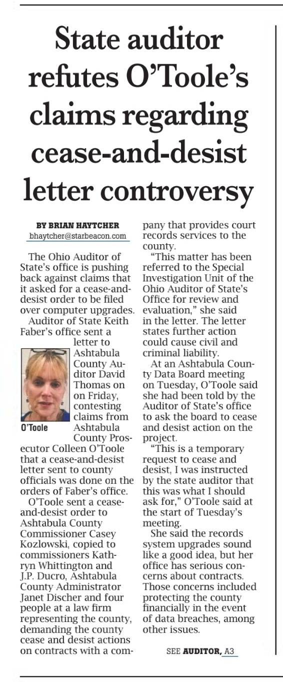 See the star beacon article here: https://www.starbeacon.com/news/local_news/state-auditor-pushes-back-on-cease-and-desist-claims/article_9a5a491a-11ec-11ee-acad-2f74a8f9ba61.html