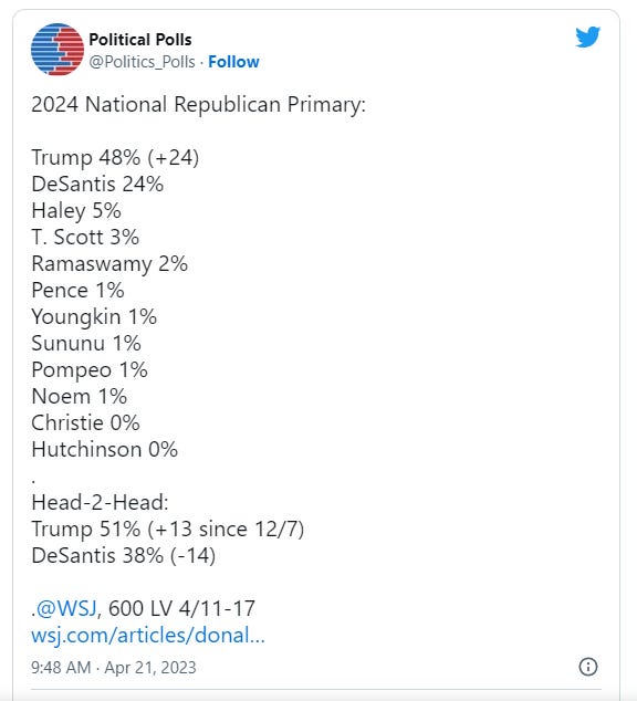 The Wall Street Journal commissioned poll – jointly conducted by Fabrizio, Lee, & Associates and Impact Research – finds that 51 percent of Republican primary voters support Trump in a hypothetical head-to-head race with DeSantis. The governor is backed by 38 percent of respondents, marking a seismic change since late last year.