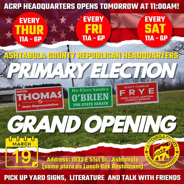 The Ashtabula County Republican Party Headquarters will be open from 11 AM - 6 PM on Thursdays, Fridays & Saturdays starting tomorrow.