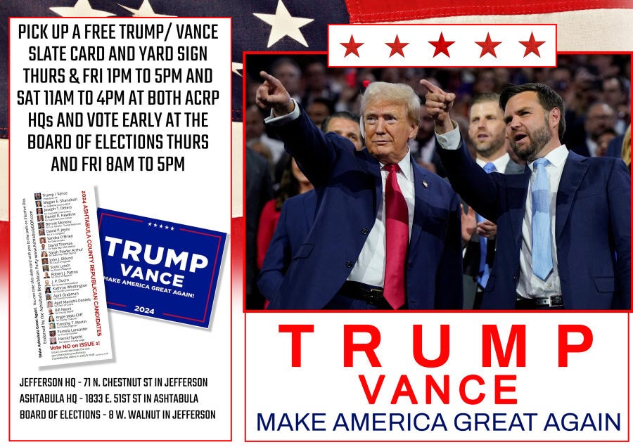 PICK UP YOUR TRUMP / VANCE AND OTHER CANDIDATE YARD SIGNS INCLUDING YOUR VOTE NO ON ISSUE 1 SIGN TO HELP SAVE OUR ELECTIONS IN OHIO AND GRAB A CANDIDATE SLATE CARD TO TAKE WITH YOU WHEN YOU GO TO VOTE! THE TRUMP STORES WILL BE OPEN AT BOTH LOCATIONS TOO.