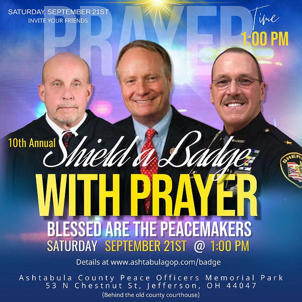 On Saturday, September 21, 2024, at 1:00 PM, the tenth annual Shield a Badge with Prayer will take place at the policeman‘s memorial in downtown Jefferson, Ohio.