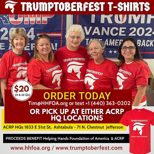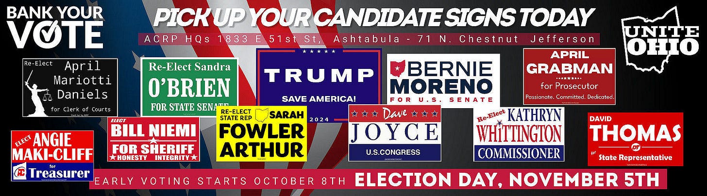 Pick up your free Trump yard sign, candidate literature, Trump gear and more at either of the Ashtabula County Republican Party headquarters Saturday!